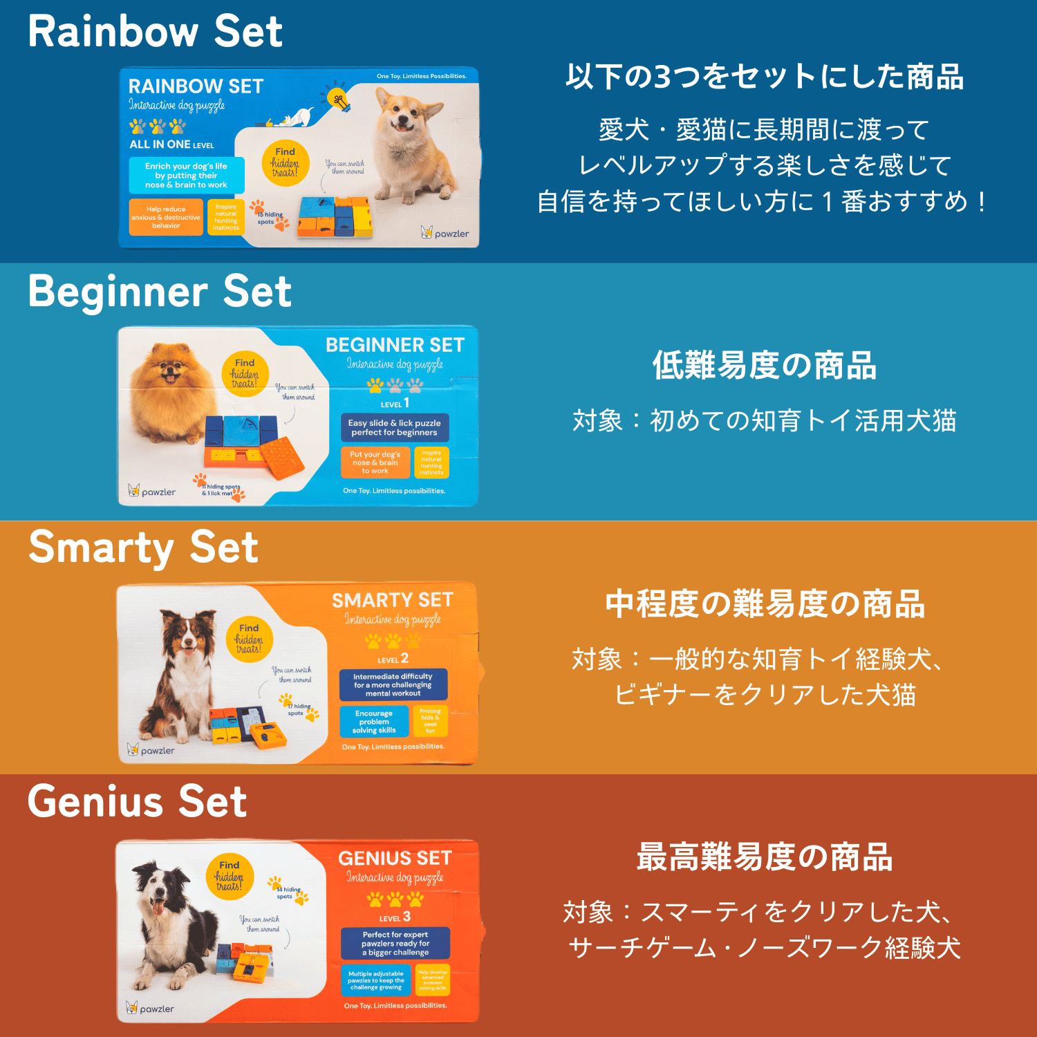 - 難易度3段階。子犬からシニア犬まで長く使える