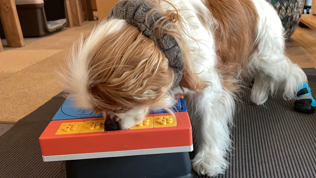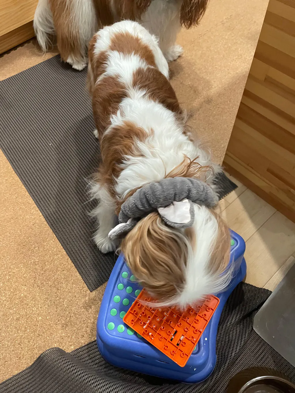 くぼみにドライフードやおやつを入れるだけ。ワンちゃんは鼻を使い、頭を使い、全力で答えを探しに行きます。いつものご飯が、夢中になれる遊びに変わります。